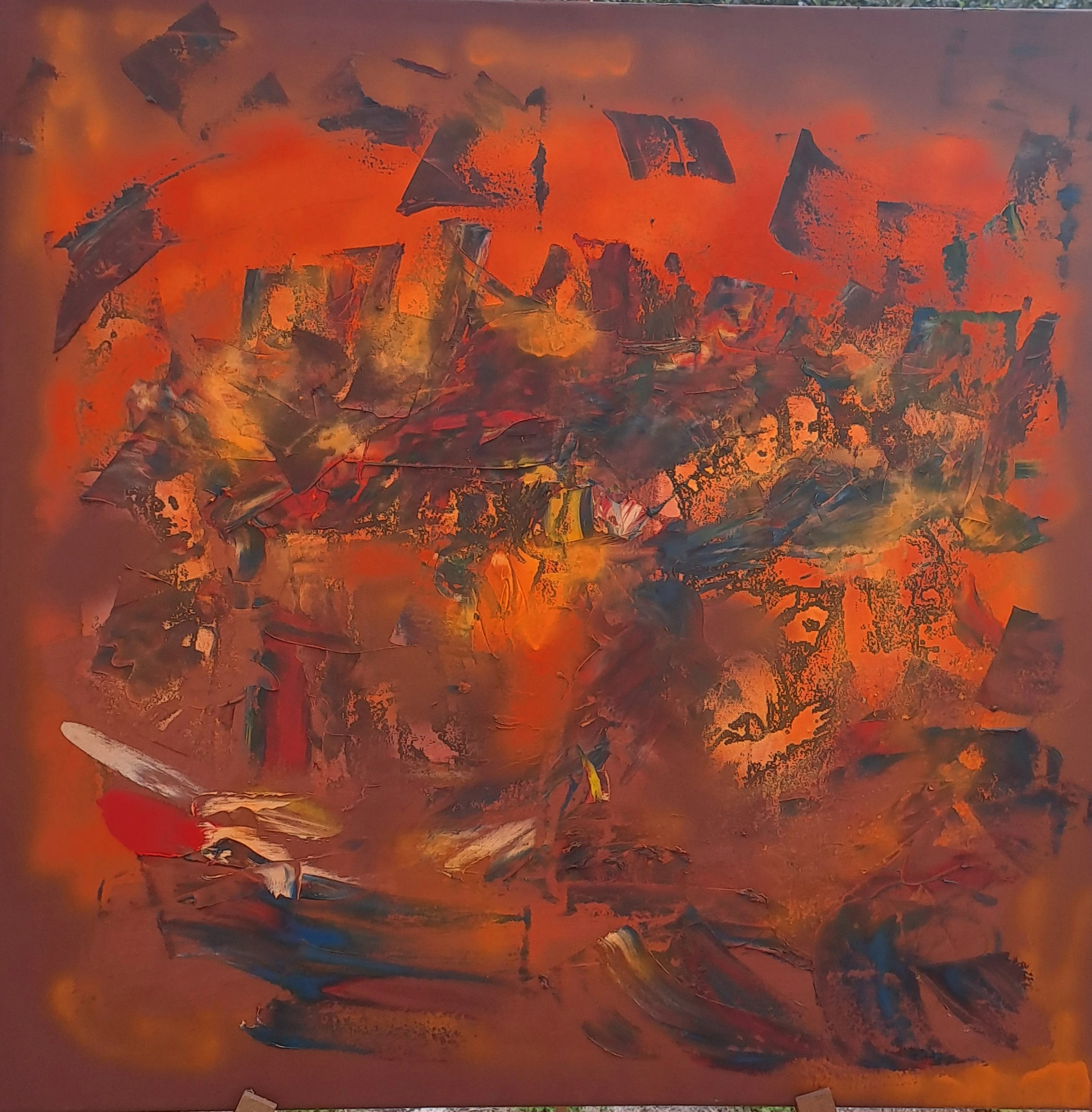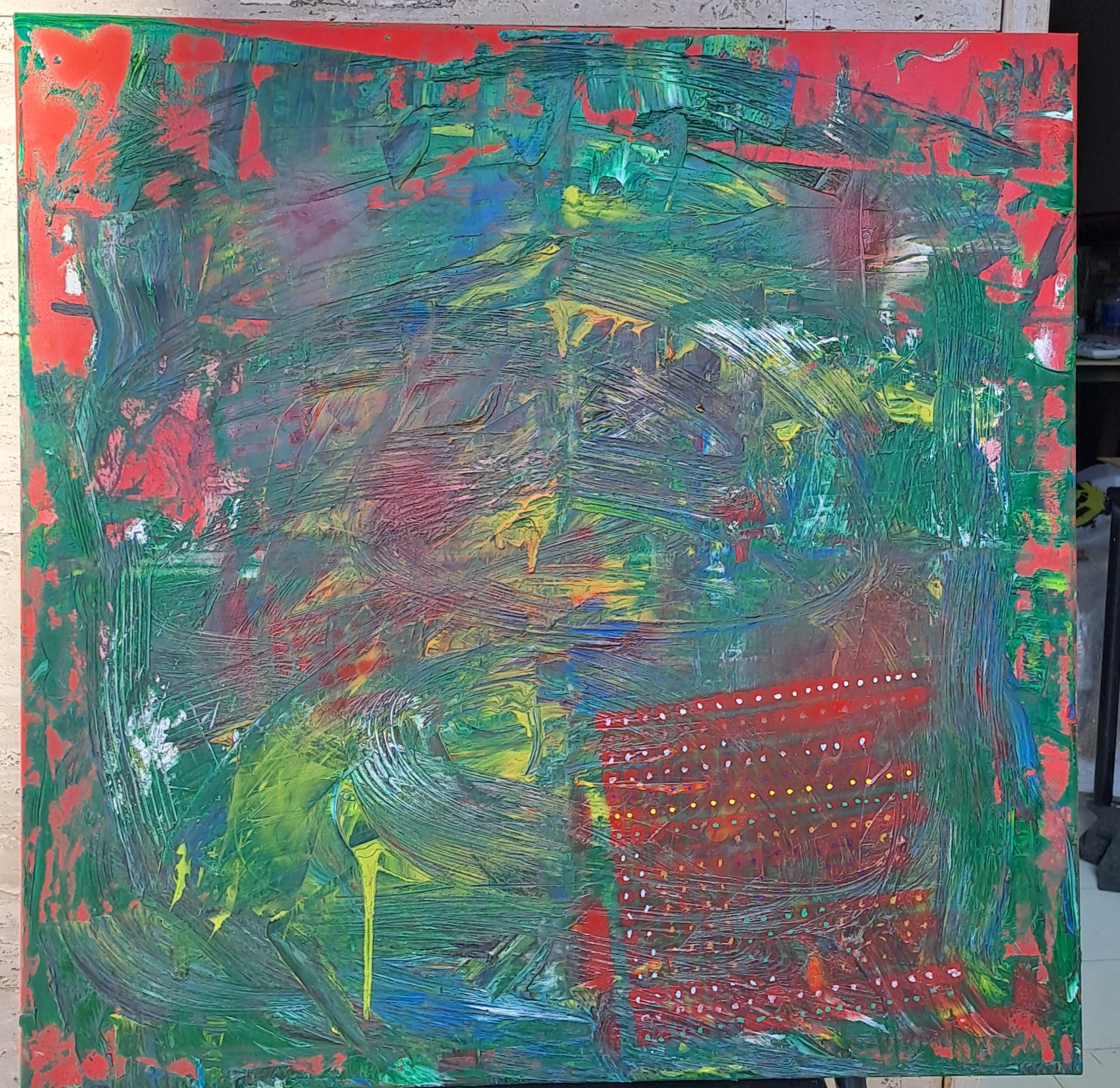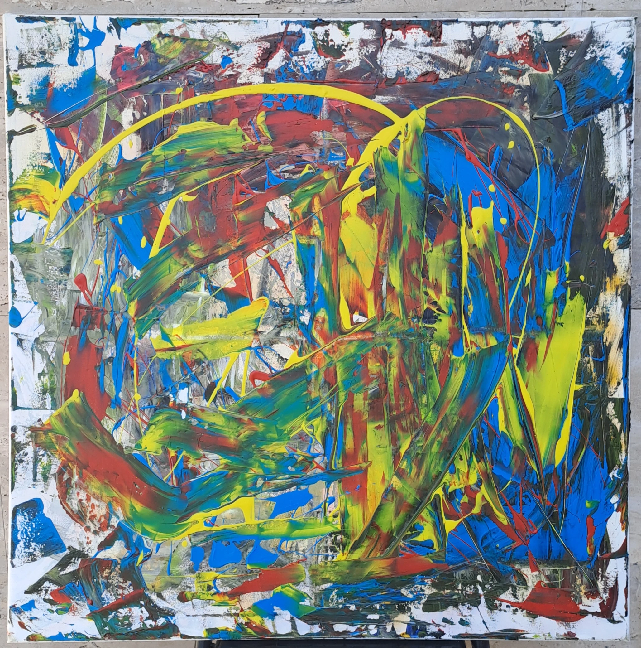 Un vortice di colori e forme si muove sulla tela, creando un'atmosfera intensa e vibrante. L'opera invita lo spettatore a immergersi in un mondo fatto di sensazioni ed emozioni.