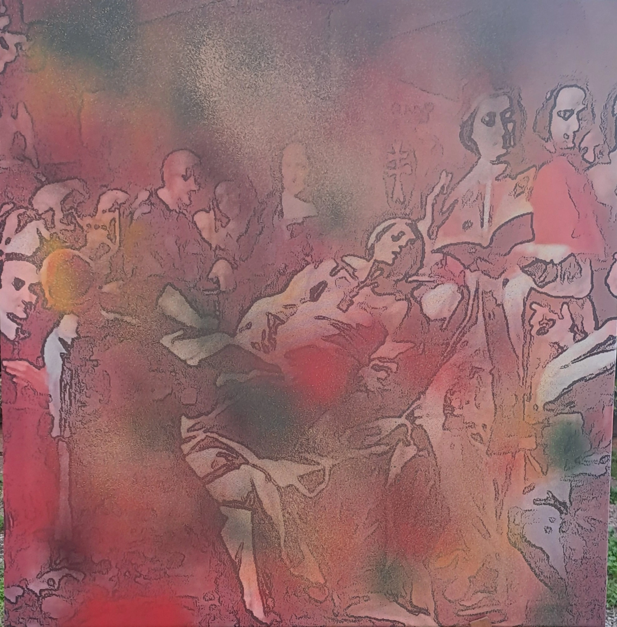 L'opera ritrae un gruppo di persone in un momento di intensa interazione. I volti, ognuno con la propria espressione, raccontano storie diverse e creano un'atmosfera coinvolgente.
