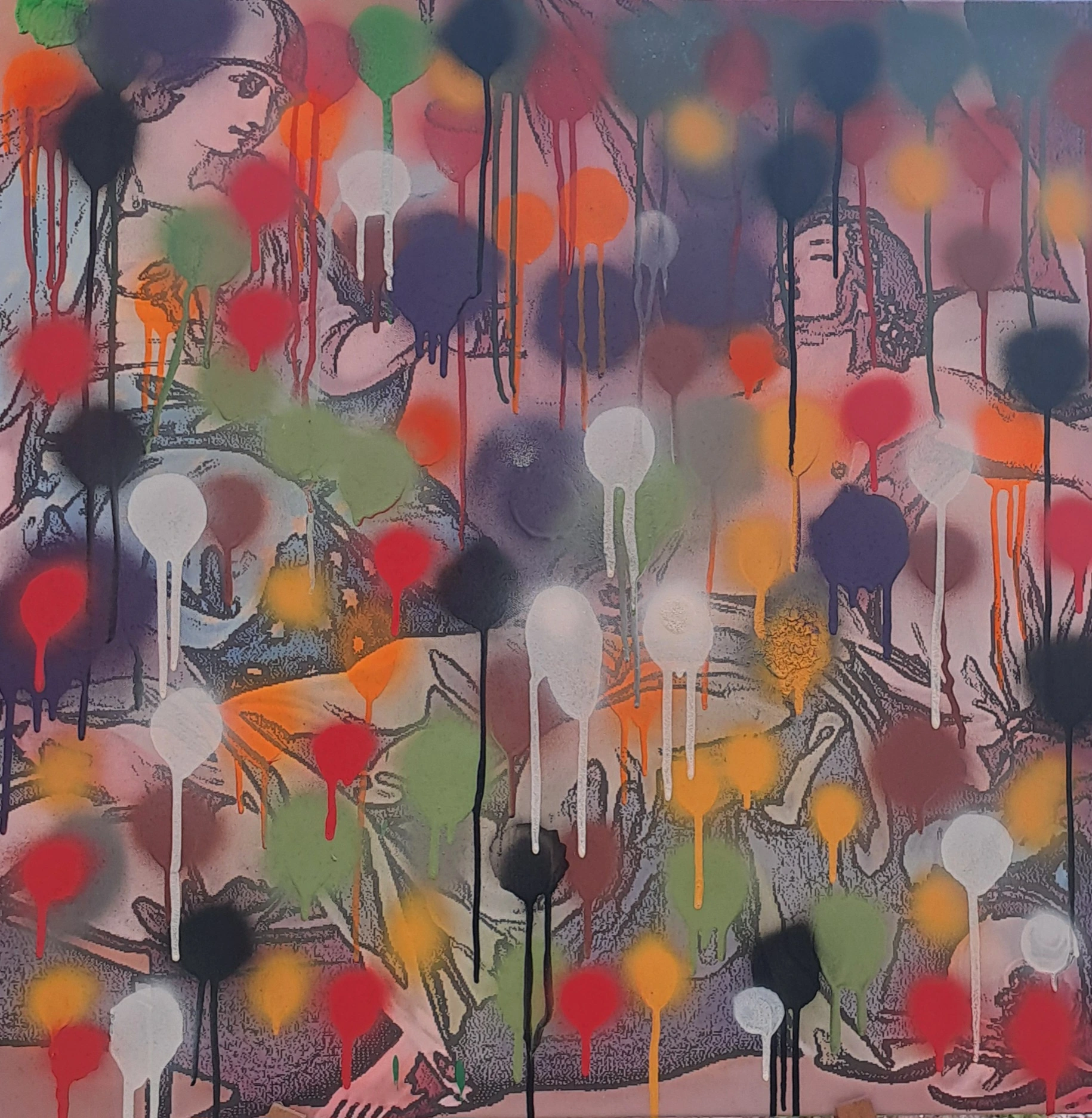 L'opera è una rivisitazione contemporanea di un classico della pittura, dove la figura femminile si trasforma in un'icona vibrante e dinamica. I colori sgargianti e le pennellate materiche creano un contrasto affascinante con la figura classica, sottolineando la fluidità del tempo e l'evoluzione della bellezza.L'artista utilizza una tecnica mista che unisce la tradizione della pittura a olio alla sperimentazione dell'acrilico, creando una superficie ricca di texture e profondità. Le gocce di colore, che sembrano scivolare sulla tela, conferiscono all'opera un senso di movimento e vitalità.