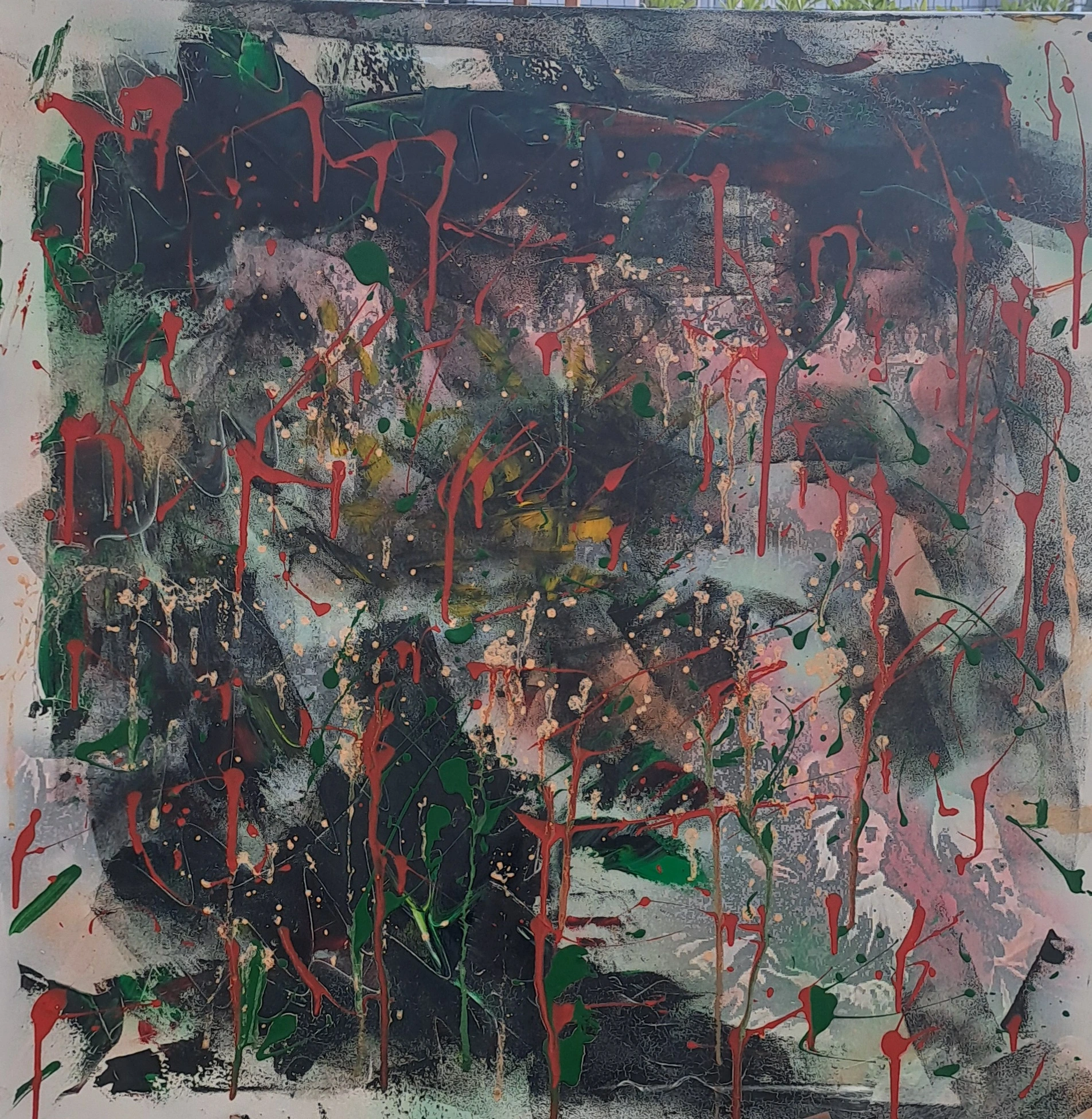 L'opera è un vortice di emozioni e sensazioni, un'esplosione di colore e materia che invita lo spettatore a immergersi in un mondo interiore profondo e complesso. Le pennellate vigorose e le gocce di colore creano una superficie dinamica e vibrante, che sembra pulsare di vita propria. Il nero, colore dominante, evoca un senso di mistero e profondità, mentre le macchie di colore più luminoso introducono note di speranza e vitalità.